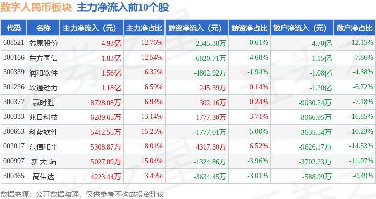 从资金流向上来看,当日数字人民币板块主力资金净流入11.23亿元,游资资金净流出9635.92万元,散户资金净流出10.27亿元。数字人民币板块个股资金流向见下表: