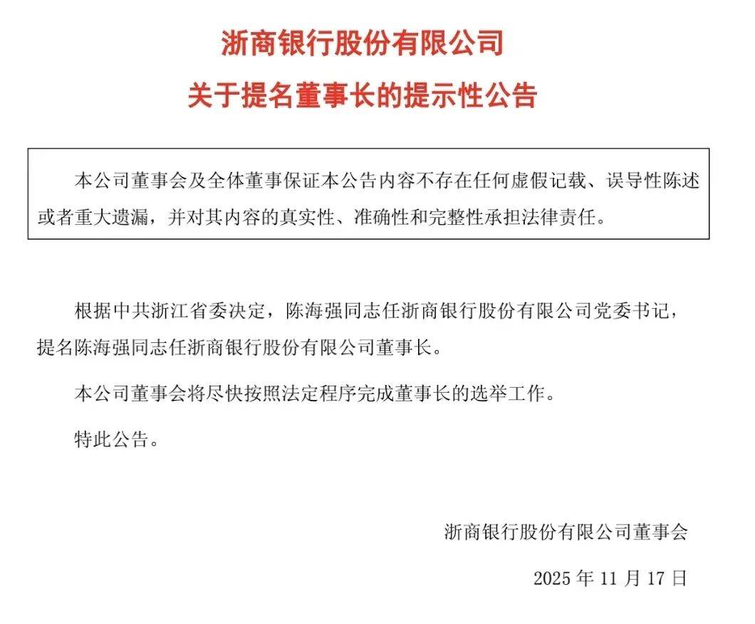 11月17日晚间,浙商银行发布公告称,根据中共浙江省委决定,提名陈海强任该行董事长。同时,该行董事会将尽快完成董事长的选举工作。