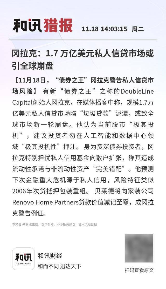 【11月18日,“债券之王”冈拉克警告私人信贷市场风险】有新“债券之王”之称的DoubleLine Capital创始人冈拉克,在媒体播客中称,规模1.7万亿美元私人信贷市场陷“垃圾贷款”泥潭,或致全球市场新一轮崩盘。他认为当前股市“极其投机”,建议投资者勿在人工智能和数据中心领域“极其投机性”押注。身为资深债券投资者,冈拉克特别担忧私人信用基金向散户扩张,称其造成流动性承诺与非流动性资产“完美错配”。他预测下次金融重大危机源于私人信用,风险特征类似2006年次贷抵押包装重组。贝莱德将向家装公司Renovo Home Partners贷款价值减记至零,成冈拉克警告例证。