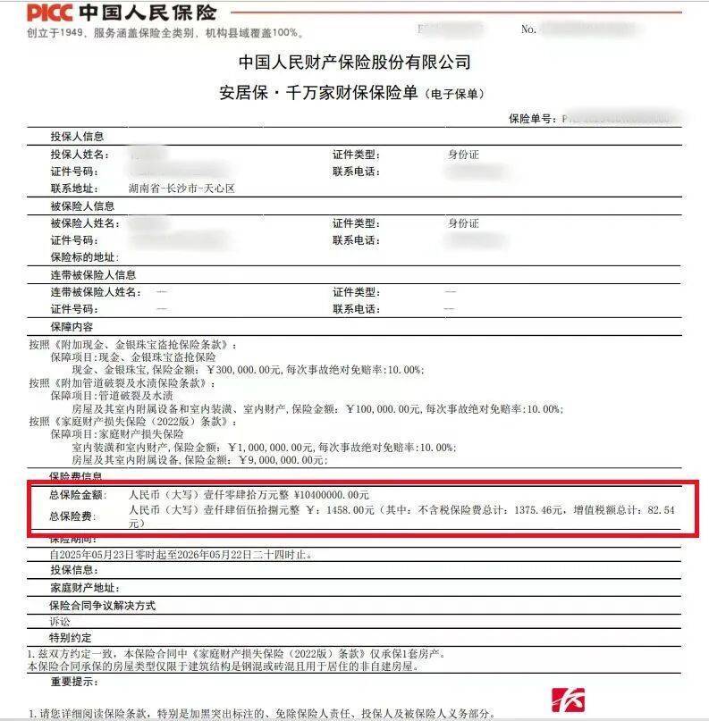 原来,报案人肖某某在今年5月22日购买了一份中国人保公司的安居保——千万家财保保险单,总保险费为1458元,总保险金额达10400000元,主要保障项目为现金以及金银珠宝盗抢保险。