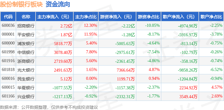 从资金流向上来看,当日股份制银行板块主力资金净流入5.77亿元,游资资金净流出4.03亿元,散户资金净流出1.74亿元。股份制银行板块个股资金流向见下表: