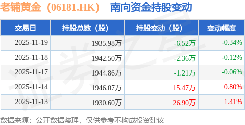 证券之星消息,11月19日南向资金减持6.52万股老铺黄金(06181.HK)。近5个交易日中,获南向资金增持的有2天,累计净增持32.28万股。近20个交易日中,获南向资金增持的有11天,累计净增持163.65万股。截至目前,南向资金持有老铺黄金(06181.HK)1935.98万股,占公司已发行普通股的13.51%。