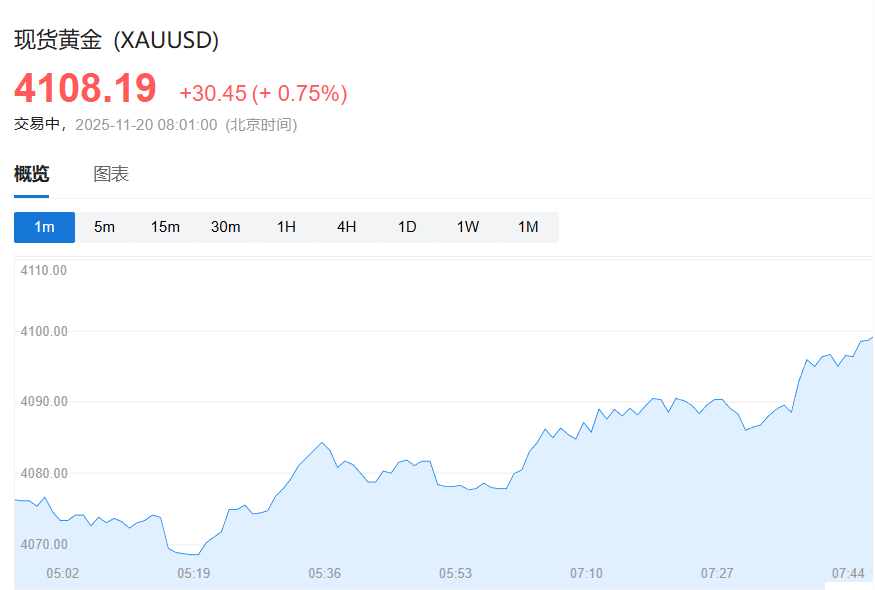现货黄金短线拉升,目前涨0.7%报4108美元/盎司。现货白银涨0.6%,报51.67美元。