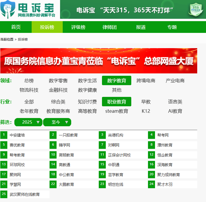 根据“电诉宝”2025年至今受理的职业教育领域用户有效投诉显示(依据投诉量排行),高顿教育排名第10位,最新评级为“建议下单”。其他被投诉的类似平台依次为:中安建培、一只船教育、尚德机构、帮考网、赛优教育、嗨学网、对啊网、潭州教育、帮考教育、正保会计网校、恒企教育、环球网校、高教通、中职通、深海教育、聚师网、中公教育、芸学教育、聚力成师教育、学慧网、大鹏教育、明世在线、聚才木羽、武汉聚师在线教育等。