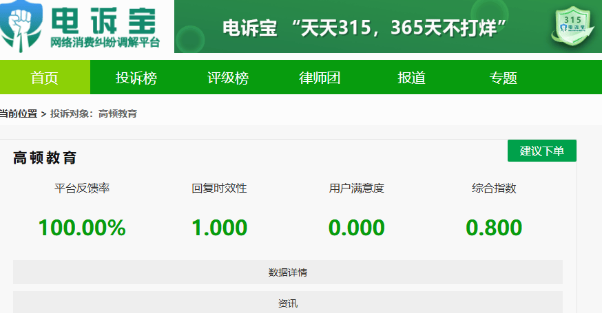 目前她要求高顿教育公司对该笔订单进行全额退款。接到以上用户投诉后,我们第一时间将投诉案件移交该平台相关工作人员督办妥善处理,但截至发稿前,我们尚未收到来自被投诉平台的任何有关处理回复。