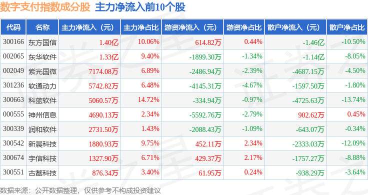 资金流向方面,数字支付(980113)指数成份股当日主力资金净流出合计8.28亿元,游资资金净流入合计7012.24万元,散户资金净流入合计7.52亿元。成份股资金流向详情见下表: