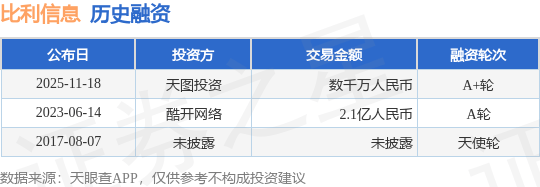 证券之星消息,根据天眼查APP于11月18日公布的信息整理,北京比利信息技术有限公司A+轮融资,融资额数千万人民币,参与投资的机构包括天图投资。