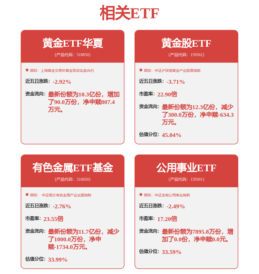 11月21日,地缘政治风险缓和,避险情绪降温,金价午盘再度下探,一度跌破4050美元关口,目前交投于4052美元/盎司附近,截至13:32,黄金ETF华夏(518850)盘中转跌0.3%,黄金股ETF(159562)跌2.19%,有色金属ETF基金(516650)跌4.01%。