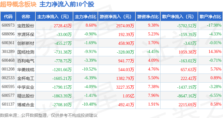 从资金流向上来看,当日超导概念板块主力资金净流出10.55亿元,游资资金净流入3.02亿元,散户资金净流入7.53亿元。超导概念板块个股资金流向见下表: