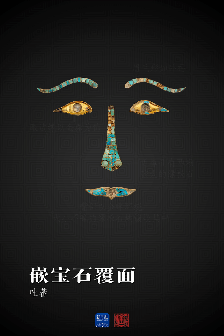 吐蕃贵族使用的不少陪葬明器也由黄金和其他贵重材料制成。这件嵌宝石覆面各部件背面均有小钉,可固定于某种材质的附着物之上,再制成覆面置于死者面部。