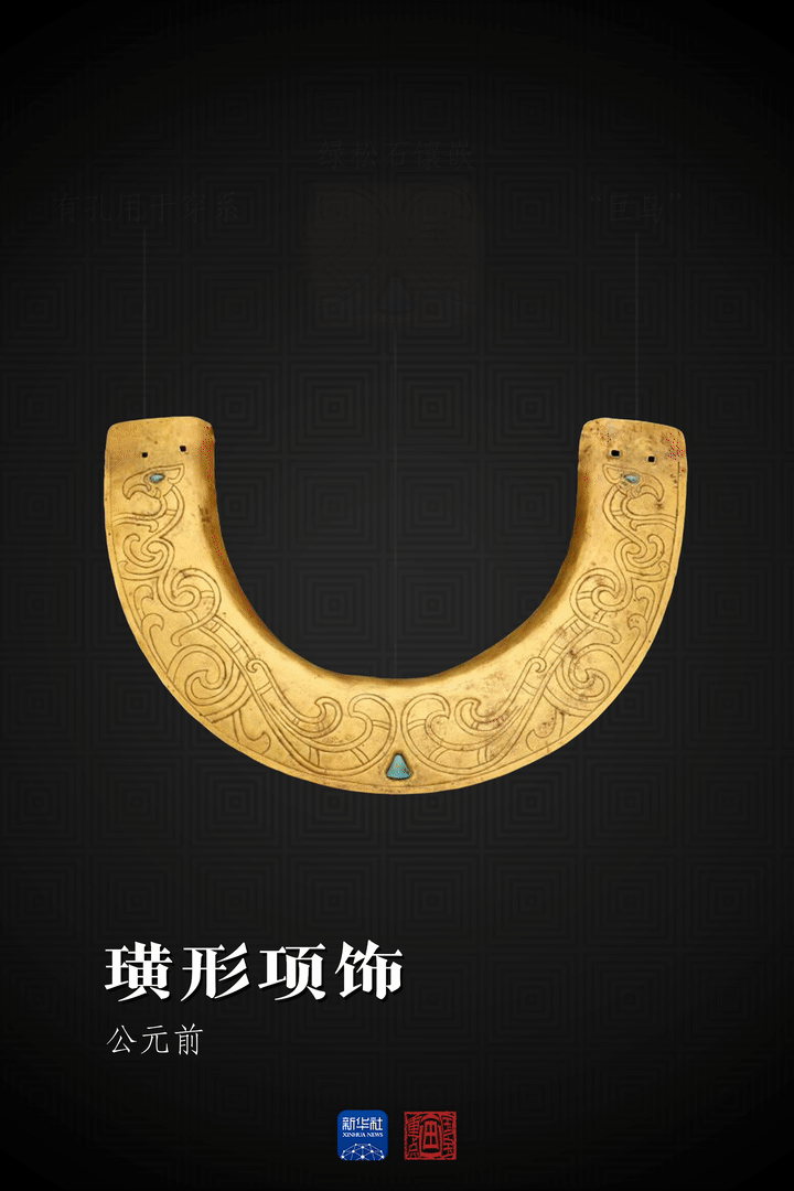 这件璜形项饰正面刻两只“巨鸟”,鸟头在项饰两端,鸟的眼睛处和项饰中央镶嵌绿松石,绿松石嵌入预留凹槽中,而非通过包镶与器物相连,反映出本土黄金工艺受到了来自欧亚草原的影响。