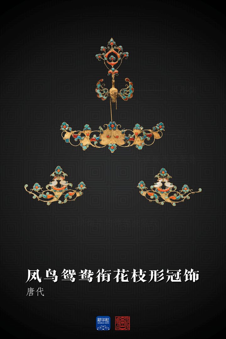 这件凤鸟鸳鸯衔花枝形冠饰由凤形饰和三块饰片组成,原为附于冠上的装饰。凤鸟身体以两块锤揲金片合成,翅膀和尾部则以镂空金片制成,缀以绿松石、红玛瑙、青蓝琉璃等。其余饰片均饰缠枝花纹,装饰手法与凤鸟相同。