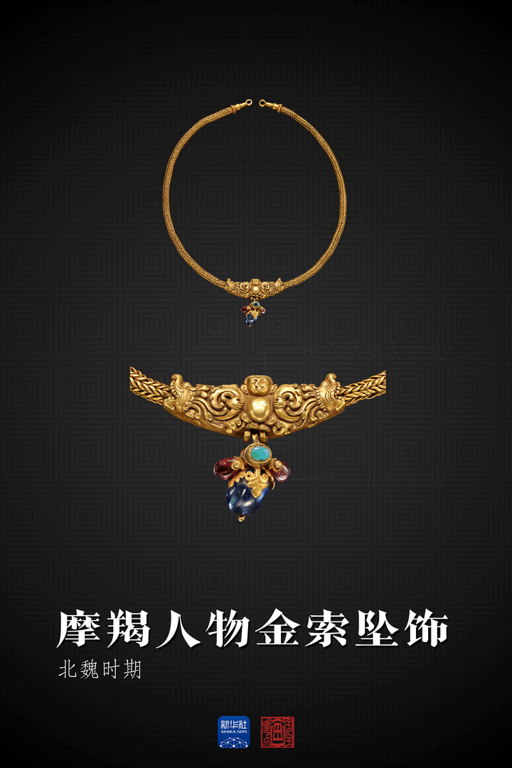 这件摩羯人物金索坠饰由锁扣、锁链及坠子组成,坠子以金钉固定。坠子正中为人形,额间开孔,形如“天眼”。人物大肚前挺,双手持抱摩羯鱼尾。两鱼张口,吞含左右链索。人物下方设一活扣,连接十字花形坠饰,镶嵌红、蓝、绿三种宝石。专家介绍,此摩羯人物纹形象可见于更早的贵霜帝国饰物,是文化交流与传播的生动例证。