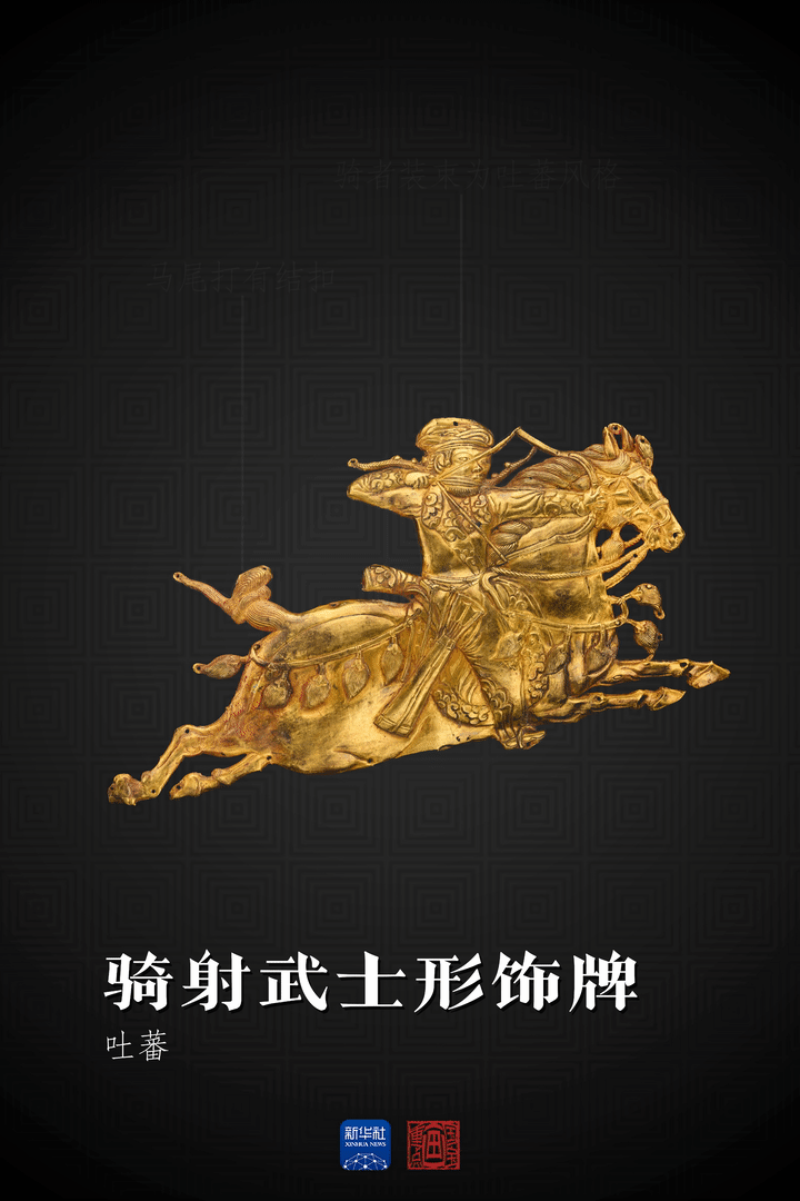 这件骑射武士形饰牌为吐蕃文物,造型威武,动感十足。骑者装束为吐蕃风格,缠头巾,头巾下垂双辫随风飞舞,双目圆瞪,络腮胡浓密,双手拉弓欲射;一身紧身三角形大翻领长袍,腰系带,其上垂挂箭囊,后露刀柄。饰牌背面残存带黑漆皮的薄木片,以金钉定缀在一起,推测原为木质器皿上的装饰。其风格可追溯至萨珊王朝金银器上的帝王狩猎图像。