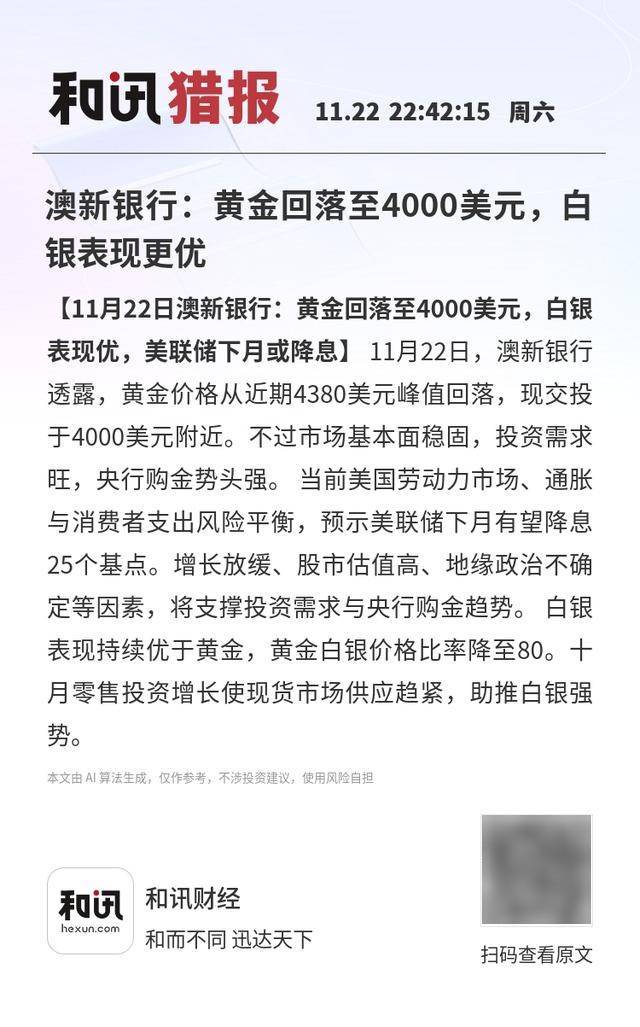 【11月22日澳新银行:黄金回落至4000美元,白银表现优,美联储下月或降息】11月22日,澳新银行透露,黄金价格从近期4380美元峰值回落,现交投于4000美元附近。不过市场基本面稳固,投资需求旺,央行购金势头强。当前美国劳动力市场、通胀与消费者支出风险平衡,预示美联储下月有望降息25个基点。增长放缓、股市估值高、地缘政治不确定等因素,将支撑投资需求与央行购金趋势。白银表现持续优于黄金,黄金白银价格比率降至80。十月零售投资增长使现货市场供应趋紧,助推白银强势。