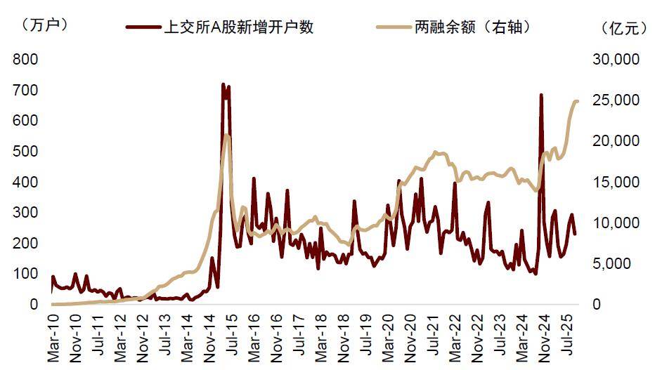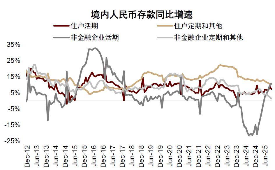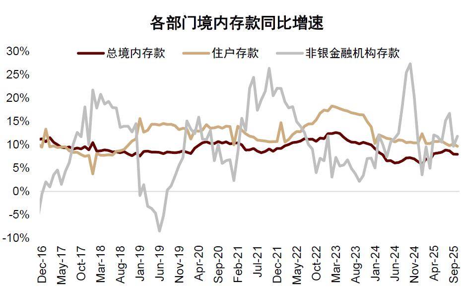 我们在8月底发布的《存款搬家如何影响A股表现?》中认为,今年下半年市场活跃度提升、增量资金入市的来源之一是居民存款搬家,并总结了截至2025年7月的居民存款搬家的数据指标和居民存款搬家的主要原因。自8月底以来的近三个月,A股整体处于震荡行情,但资金面仍保持较高活跃度,一定程度上与居民存款搬家的持续进行有关。从数据上看:1)非银存款增速继续保持相对高位,8/9/10月同比分别涨16.7%/9.7%/11.8%。2)活期存款增速继续回升。住户活期存款增速从2024年年初接近于0的水平修复至2025年10月的7.4%,增速相比7月的6.8%继续回升;住户定期和其他存款增速从2024年初的15%左右下行至2025年10月的10.5%,增速较7月的11.5%继续回落。与此同时,非金融企业存款活化也在延续,非金融企业活期存款增速自6月转正后继续上行,10月修复至10.7%,非金融企业定期和其他存款增速则由2月的7.3%下行至10月的1.4%。3)投资者活跃度仍处于相对高位。8-10月上证所新开户数均超过230万,两融余额自2025年4月底的1.8万亿元上升至10月底的2.5万亿元,11月以来随着市场震荡趋于平缓,但未出现明显下行。以自由流通市值计算的换手率有所回落,约4%左右,仍高于历史均值,且又距离5%的拥挤度警戒线有一定距离。