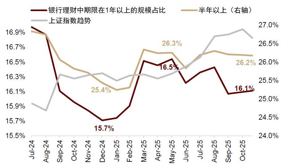 除以上指标外,近期银行理财的期限结构变化或也与存款搬家有关,主要体现在较长期限的银行理财规模占比随着市场的回暖有所降低。2024年9月底市场回暖,银行理财期限在1年以上/6个月以上的规模占比从2024年8月的16.9%/26.7%下降至12月的15.7%/25.4%。此后,市场进入一段振荡期,随着震荡时间延长,较长期限的银行理财占比有所回升,至2025年5月,银行理财期限在1年以上/6个月以上的规模占比回升至16.5%/26.3%。2025年6月底至8月底,股市进入一段较快上行期,较长期限的银行理财占比再度回落,至10月回落至16.1%/26.2%。截至2025年11月21日,现存期限在1年以上/6个月以上的银行理财规模为4.7/7.6万亿元,占银行理财总额的16.11%/26.17%。