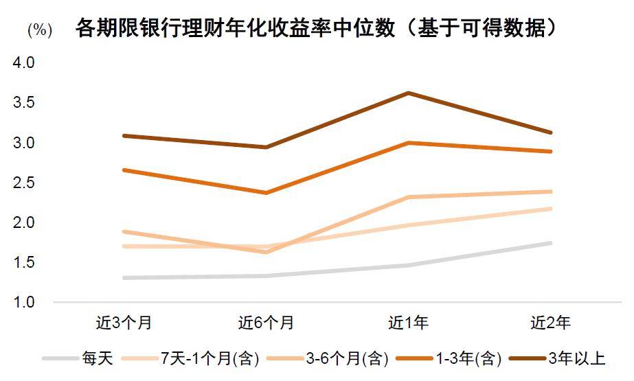 从原因上分析:一方面,低利率环境下银行理财整体收益率有所下降。根据Wind可得数据,近1年来看,期限为每天/7天-1个月/3-6个月/1-3年/3年以上的银行理财年化收益率中位数分别为1.46%/1.97%/2.32%/3.00%/3.62%;而近半年来看,分别为1.33%/1.70%/1.63%/2.37%/2.94%。另一方面,长短期限的收益率差有所降低,例如期限为3年以上和每天的理财年化收益率差距从2.16ppt降至1.61ppt。与此同时,短期理财相比长期理财的高流动性和低波动优势仍在,尤其是考虑到近一年权益市场回暖,资金流动性重要性有所提升,偏长期理财的整体性价比有所下降。