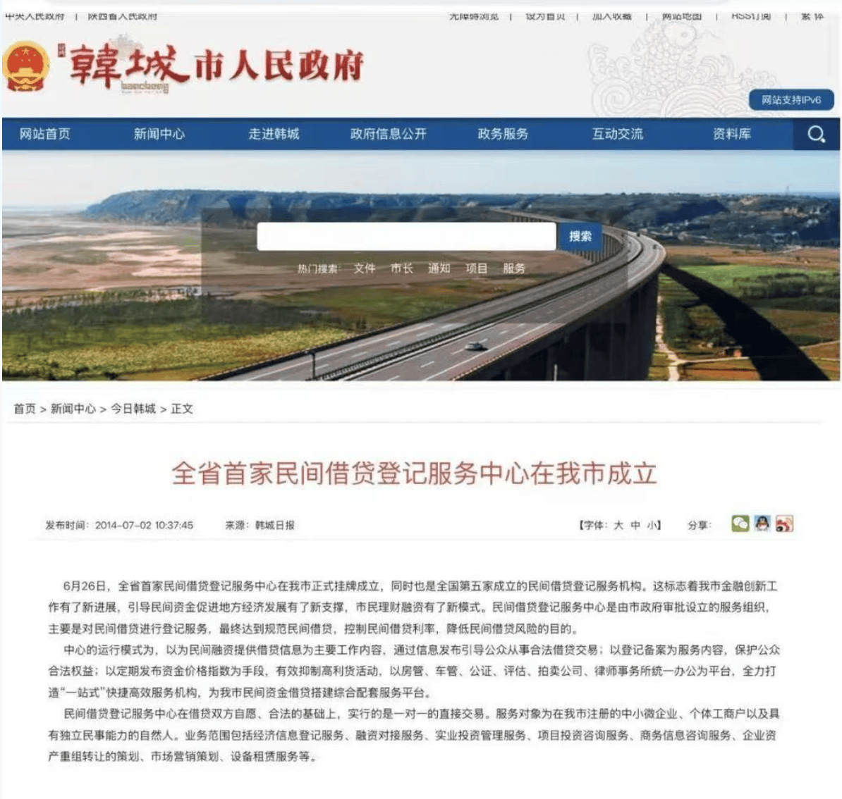 公开资料显示,韩城市民间借贷登记服务中心成立于2014年6月,是经韩城市政府批准设立的陕西省首家民间借贷服务机构。该中心从设立之初就带有明确的政策使命,被定位为“规范民间融资、支持中小微企业”的金融创新平台。韩城日报曾多次对其进行专题报道,刊发的《创新融资:民间借贷撬动大产业》一文中,称赞其“为闲散资金找到了方便、高效、安全的投资渠道”。在官方宣传中,该平台被塑造为政府主导的合规金融试点,多位出借人也曾公开表示对其“政府背景”下的运营充满信心。