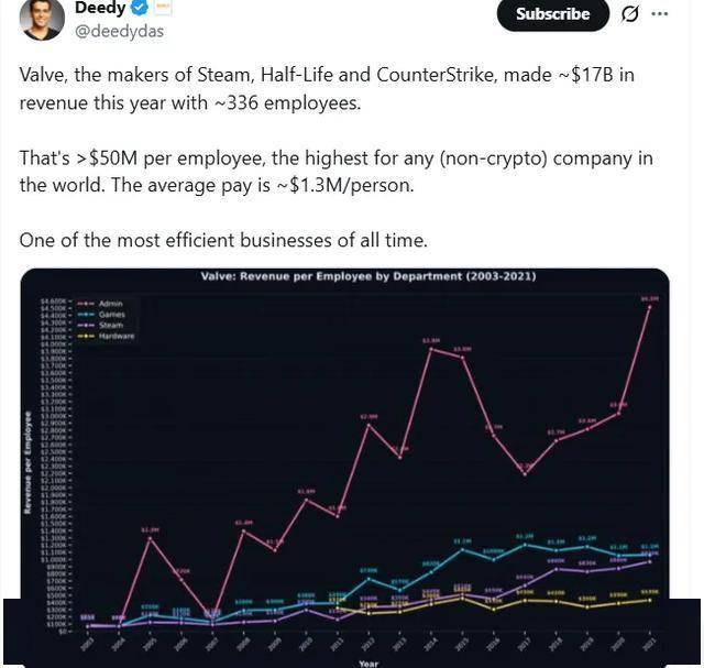 根据社交平台用户Deedydas披露的信息,Valve在2025年实现人均创收5000万美元,这一数字使其超越所有非加密货币企业,位居全球效率榜首。目前Valve拥有约336名员工,预计2025年总收入将达到约170亿美元。在此榜单中排名第二的OnlyFans,其人均创收约为3000万美元,与Valve存在明显差距。