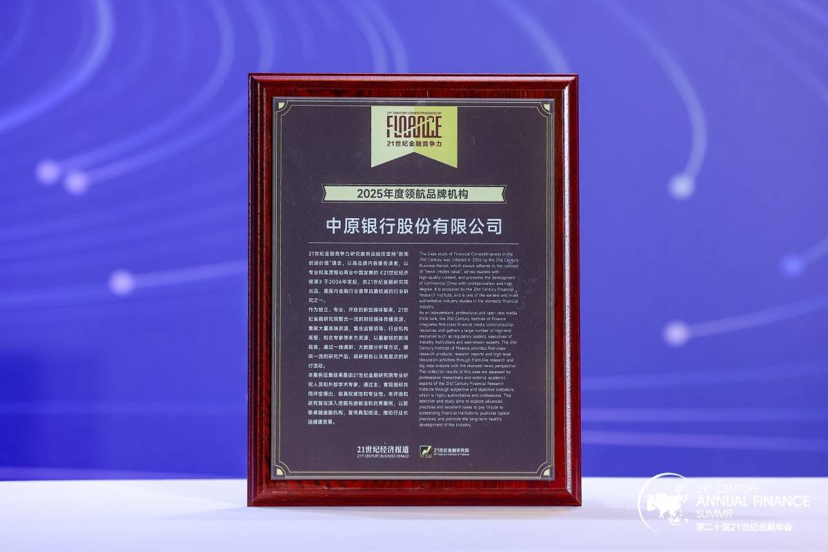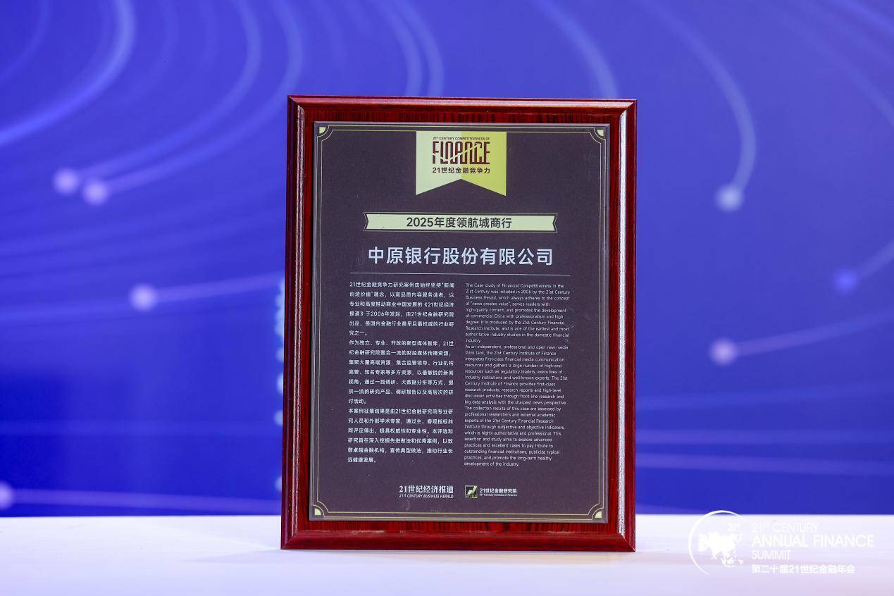 【大河财立方 记者 秦龙】11月22日,在《21世纪经济报道》主办的“第二十届21世纪金融年会”上,2025年21世纪金融竞争力研究案例正式揭晓。中原银行获“2025年度领航品牌机构”“2025年度领航城商行”两项荣誉称号。