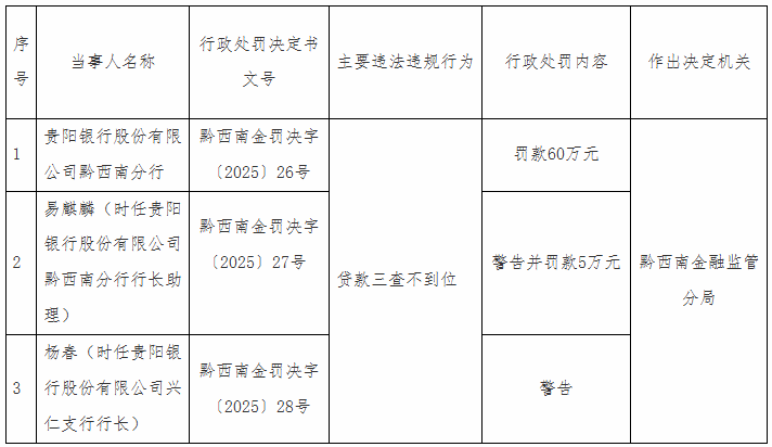 【大河财立方消息】11月25日,国家金融监督管理总局黔西南监管分局披露的行政处罚信息显示,因贷款三查不到位,贵阳银行黔西南分行被罚60万元,时任贵阳银行黔西南分行行长助理易麒麟被警告并罚款5万元,时任贵阳银行兴仁支行行长杨春被警告。