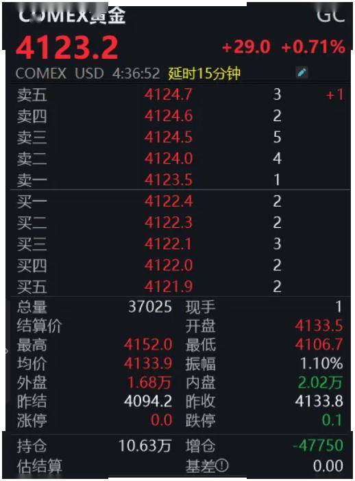 期货市场同步走强,COMEX黄金期货延续上涨行情。截至记者发稿,COMEX黄金期货日内上涨0.71%,报4123.2美元/盎司,盘中最高触及4133.5美元/盎司。