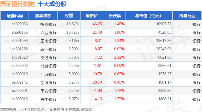 证券之星消息,11月25日,国证银行(399431)指数报收于8240.45点,涨1.33%,成交288.85亿元,换手率0.29%。当日该指数成份股中,上涨的有28家,南京银行以2.65%的涨幅领涨,下跌的有2家,齐鲁银行以0.34%的跌幅领跌。
