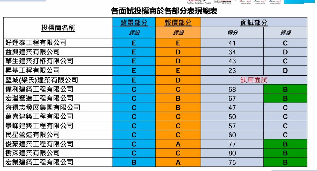 九派新闻注意到,回标分析报告中,57家承建商最终筛选出5家,其中包括宏业建筑工程有限公司,其在背景部分评级为B,报价部分评级为A,面试部分为75分,综合评级为B。