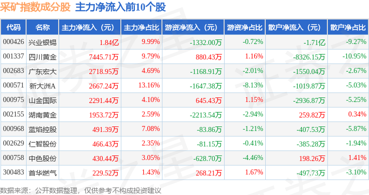 资金流向方面,采矿指数(399232)成份股当日主力资金净流出合计7674.83万元,游资资金净流出合计7149.61万元,散户资金净流入合计1.48亿元。成份股资金流向详情见下表: