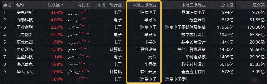 细分方向来看,消费电子龙头安克创新领涨超4%;半导体龙头闻泰科技涨超4%,兆易创新涨逾2%;PCB(印制电路板)龙头生益科技涨超1%。市场热议的“纪连海”方面,寒武纪一度大涨5%,工业富联最高涨超7%,海光信息盘中涨逾8%。
