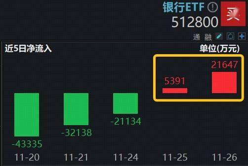 值得注意的是,近日规模最大银行ETF(512800)再获资金掉头增仓。上交所数据显示,银行ETF(512800)近2日连续获资金净流入2.7亿元。