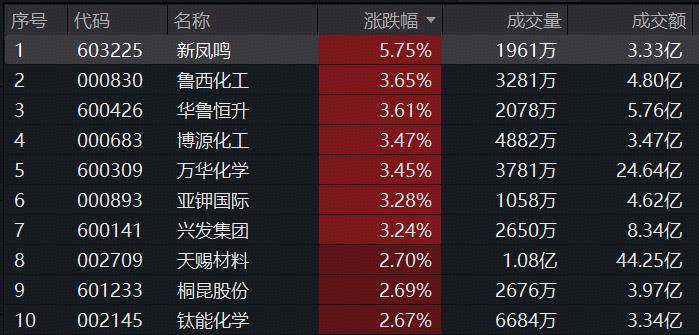成份股方面,新凤鸣涨近6%居前,鲁西化工、华鲁恒升、博源化工、万华化学、亚钾国际等多股涨逾3%。