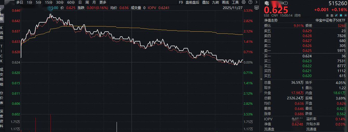 或由于六部门印发促消费新方案,超107亿主力资金涌入电子板块,板块吸金额高居31个申万一级行业首位,热门ETF方面,汇聚电子板块核心龙头的电子ETF(515260)早盘活跃,场内价格最高上探3.53%,后被大盘拖拽,涨幅逐步缩窄,最终收涨0.16%,一举收复10日均线,斩获日线3连涨。