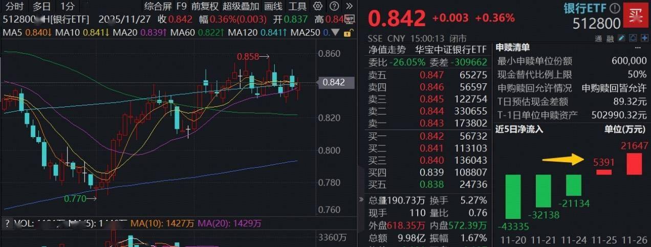 银行再度彰显防御性,农业银行涨超2%,沪农商行、青岛银行、杭州银行、浦发银行等8股涨逾1%。规模最大银行ETF(512800)早盘低开,自水下单边向上翻红,午后维持窄幅震荡,场内价格逆市收涨0.36%,收复5日、10日线,全天成交额9.98亿元,环比放量1.2亿元。