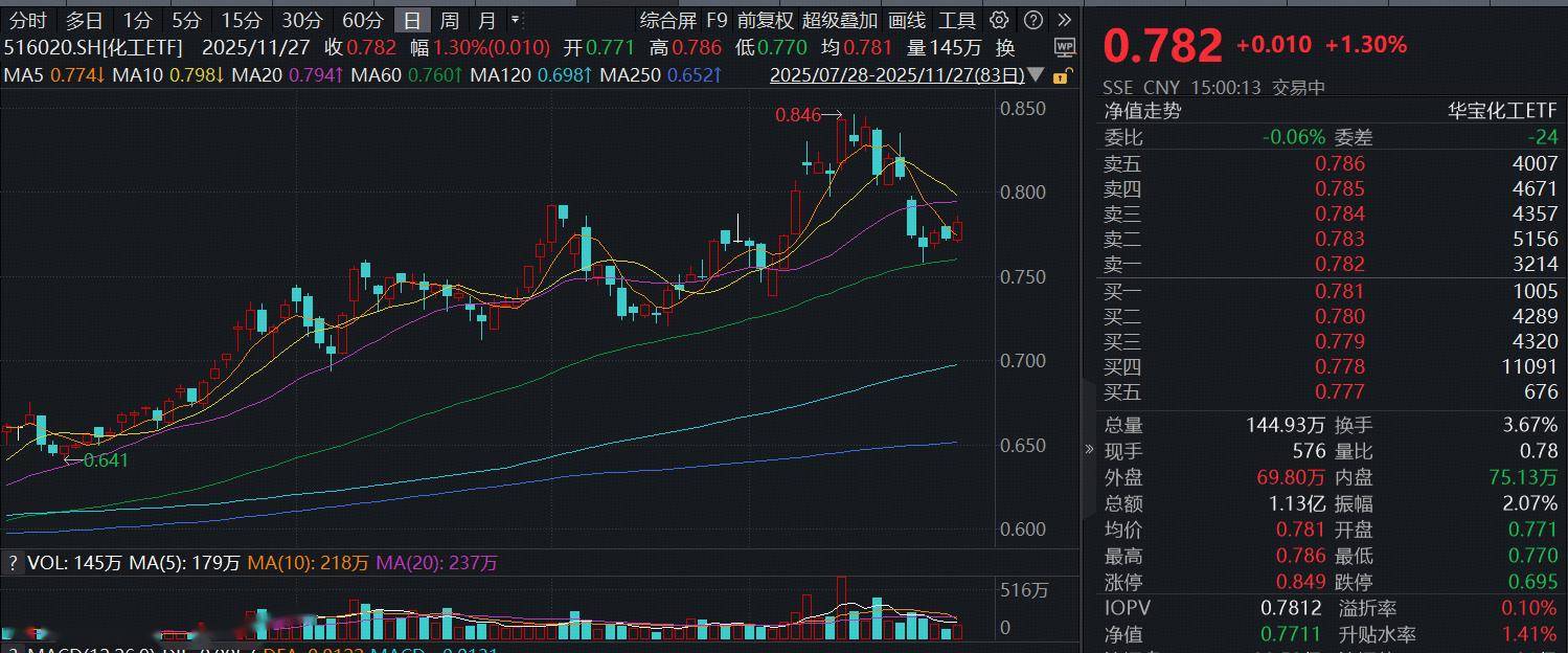大市冲高回落之际,化工板块强势反超领涨,反映化工板块整体走势的化工ETF(516020)开盘冲高后小幅震荡,午后发力一度涨超1.8%,截至收盘,放量涨1.30%,单日成交额1.13亿元。