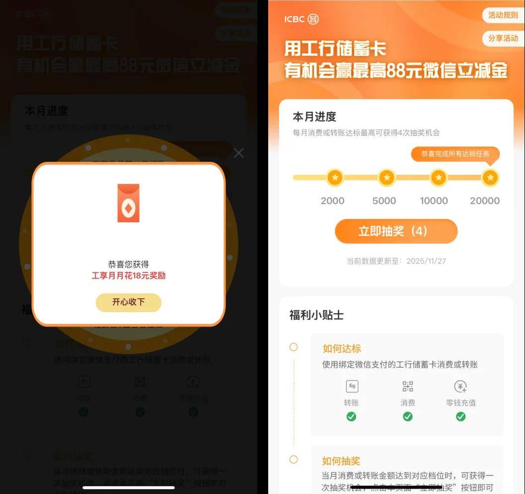 目前建行、中行、工行都有微信消费的活动,工行有2个任务,都可以用储蓄卡无损解决。