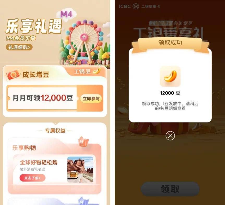 每月工银i豆顺手领一下,老胡现在是M4,可以领1.2万豆,价值12元。