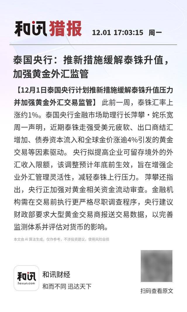 【12月1日泰国央行计划推新措施缓解泰铢升值压力并加强黄金外汇交易监管】此前一周,泰铢汇率上涨约1%。泰国央行金融市场助理行长萍攀·姹乐宽周一声明,近期泰铢走强受美元疲软、出口商结汇增加、债券资本流入和全球金价涨逾4%引发的黄金交易等因素驱动。 央行拟提高企业可留存境外的外汇收入限额,该调整预计年底前生效,旨在增强企业外汇管理灵活性,减轻泰铢上行压力。 萍攀还指出,央行正加强对黄金相关资金流动审查。金融机构需在交易前执行更严格尽职调查程序,央行建议财政部要求大型黄金交易商报送交易数据,以完善监测体系并评估对货币的影响。
