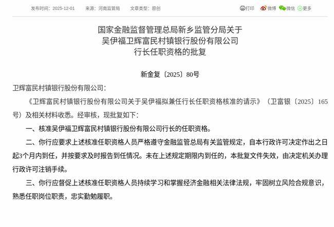 2025年12月1日,根据国家金融监督管理总局消息,《卫辉富民村镇银行股份有限公司关于吴伊福拟兼任行长任职资格核准的请示》获得通过,批复吴伊福卫辉富民村镇银行股份有限公司行长的任职资格。