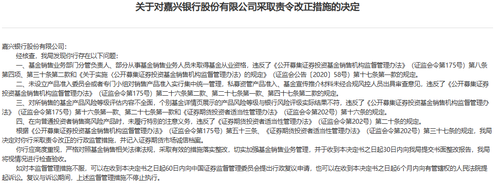 浙江证监局认为,嘉兴银行上述行为违反了有关规定,根据相关法律法规,决定对其采取责令改正的行政监管措施,并记入证券期货市场诚信档案。