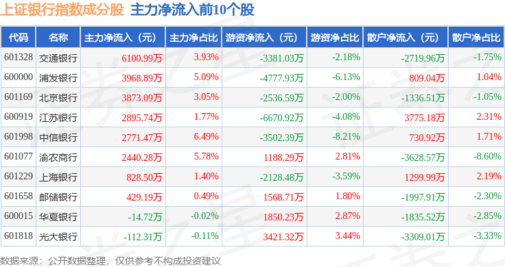 资金流向方面,上证银行(000134)指数成份股当日主力资金净流出合计7.44亿元,游资资金净流出合计585.61万元,散户资金净流入合计7.5亿元。成份股资金流向详情见下表: