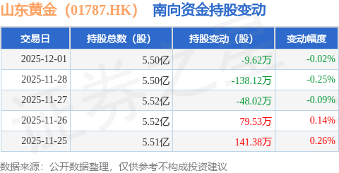 证券之星消息,12月1日南向资金减持9.62万股山东黄金(01787.HK)。近5个交易日中,获南向资金增持的有2天,累计净增持25.12万股。近20个交易日中,获南向资金增持的有10天,累计净增持1015.47万股。截至目前,南向资金持有山东黄金(01787.HK)5.5亿股,占公司已发行普通股的55.24%。