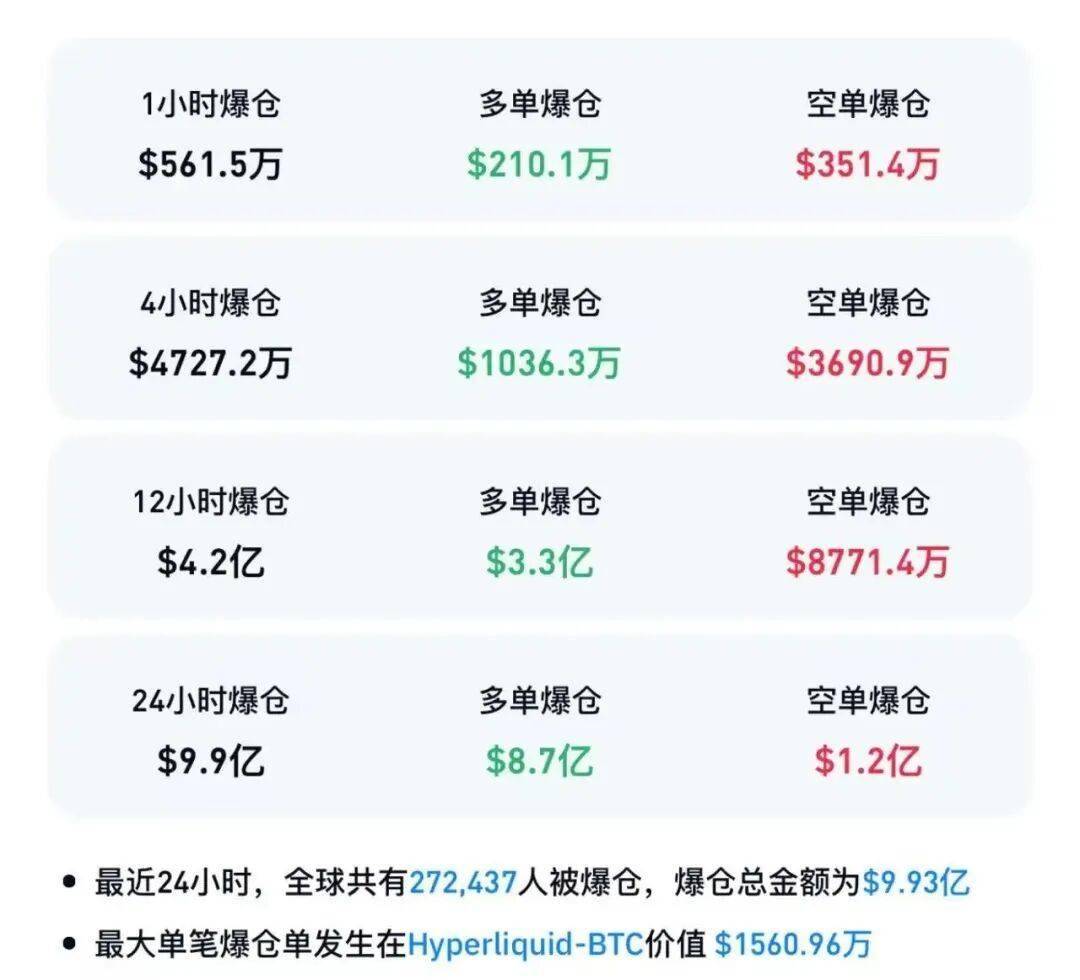 根据CoinGlass最新数据,过去24小时加密货币市场共有272437人爆仓,爆仓总金额为9.93亿美元。