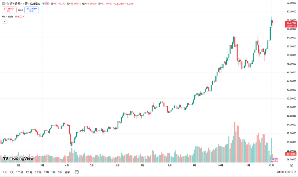 周一,白银价格一度触及每盎司58.84美元的历史新高,延续了上周五近6%的涨幅,并已连续六个交易日上涨。今年以来,白新价值几乎翻了一番,其涨幅远超黄金约60%的强劲表现。
