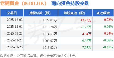 证券之星消息,12月2日南向资金增持13.73万股老铺黄金(06181.HK)。近5个交易日中,获南向资金增持的有2天,累计净增持2.12万股。近20个交易日中,获南向资金增持的有8天,累计净增持82.09万股。截至目前,南向资金持有老铺黄金(06181.HK)1927.01万股,占公司已发行普通股的13.45%。
