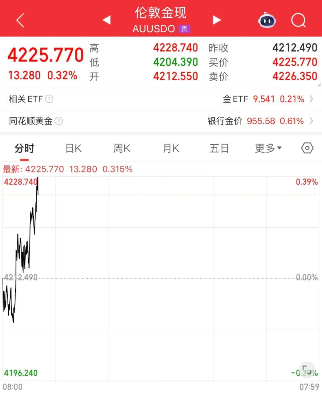 △伦敦现货黄金走势图(截图自同花顺)