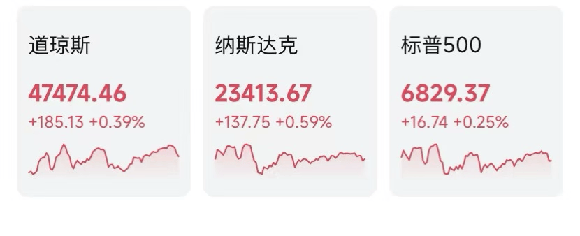 当地时间周二,美股三大股指小幅收涨,截至收盘,道指涨0.39%报47474.46点,标普500指数涨0.25%报6829.37点,纳指涨0.59%报23413.67点。