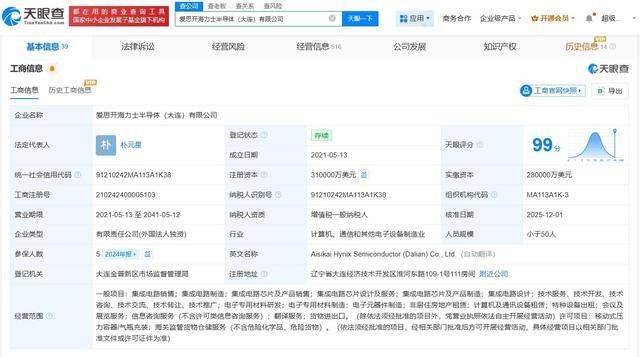 天眼查App显示,近日,爱思开海力士半导体(大连)有限公司发生工商变更,注册资本由28亿美元增至31亿美元,增幅约10.71%。