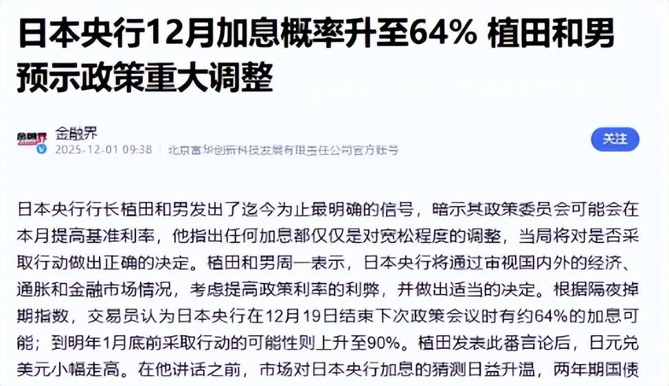 他在名古屋的演讲也好,在国会的表态也罢,哪怕仅仅是一句鹰派的暗示,就直接把市场对12月加息的押注概率从三成强行拉升到了六成,对明年1月加息的预期近乎90%,这意味着延续了十余年的“超宽松神话”,将在12月19日的议息会议上迎来真正的审判日。